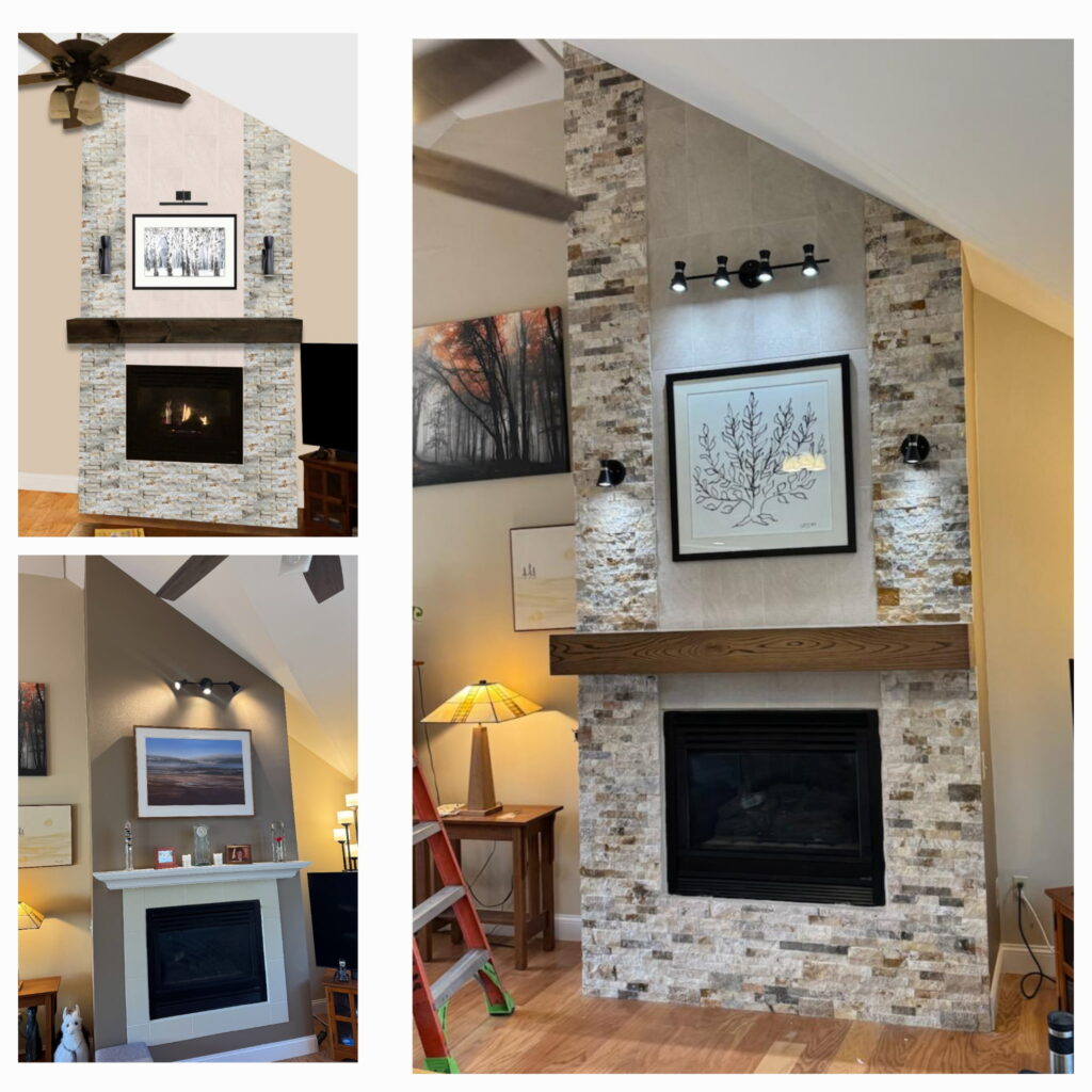 For this project with Oak & Stone, I used Photoshop to create design renderings that allowed the clients to visualize options before construction. The top-left image shows the selected concept, the bottom-left is the “before,” and the right image is the completed remodel. Providing visual options streamlined decision-making and saved both Oak & Stone and their client time and money.